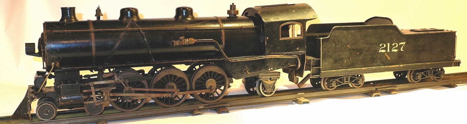 Boucher was not strictly a toy company. They produced models: industrial models for exhibition; yacht models for racing; live steam boilers, engines and fittings for model steamships; and the old Voltamp line of trains which at the time were the most realistic toy trains in the country. That is why Boucher's slogan was "Toys that are more than just Toys". One imagines that H.E.Boucher would have preferred to skip the "Toy" part of the slogan altogether. So when in 1923 Boucher announced a 1 gauge live steam locomotive, it should not have come as any surprise. A picture of the catalog illustration is in the following Tinplate Times article, and a catalog picture with detailed description of the locomotive can be found in Graham Claytor's TCA Quarterly article on operating live steam locomotives in the winter edition, 1981, Vol 27, no 1.